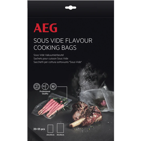 A técnica SousVide intensifica todos os sabores ao máximo. Basta selar os ingredientes escolhidos a vácuo e a química entre os sabores naturais e os nutrientes desenvolve-se sem ser prejudicada pelo ar. Podem ser utilizados com temperatura até 120 °C para cozinhar ou -40°C para conservar. Dimensões: 25 + 25 sacos por conjunto, 2 tamanhos – 30 x 20 cm e 35 x 25 cm. Para utilizar nos fornos a vapor AEG com o programa SousVide.